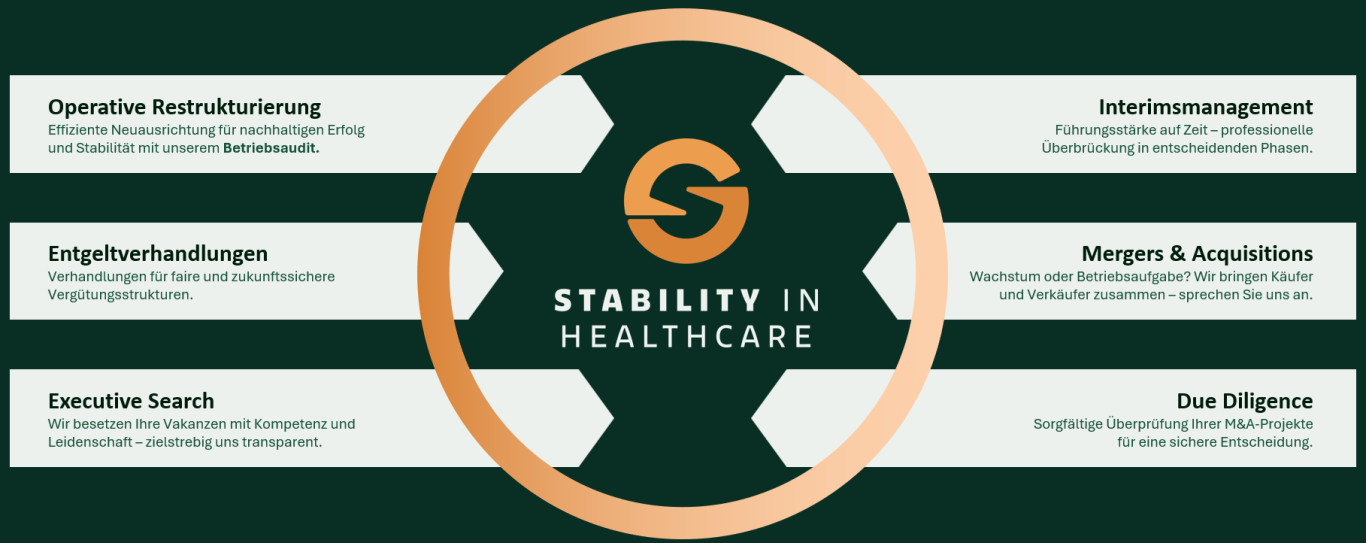 Wir verstehen uns als Full-Service-Dienstleister im Segment der Betriebsstabilisierung und -entwicklung im Gesundheitswesen: mit unserem erfahrenen und multiprofessionellen Team finden wir passgenaue Lösungen, die Sie und Ihren Betrieb nachhaltig zum Erfolg führen.